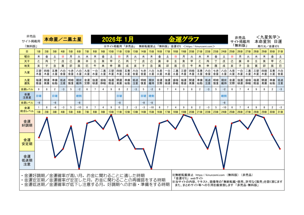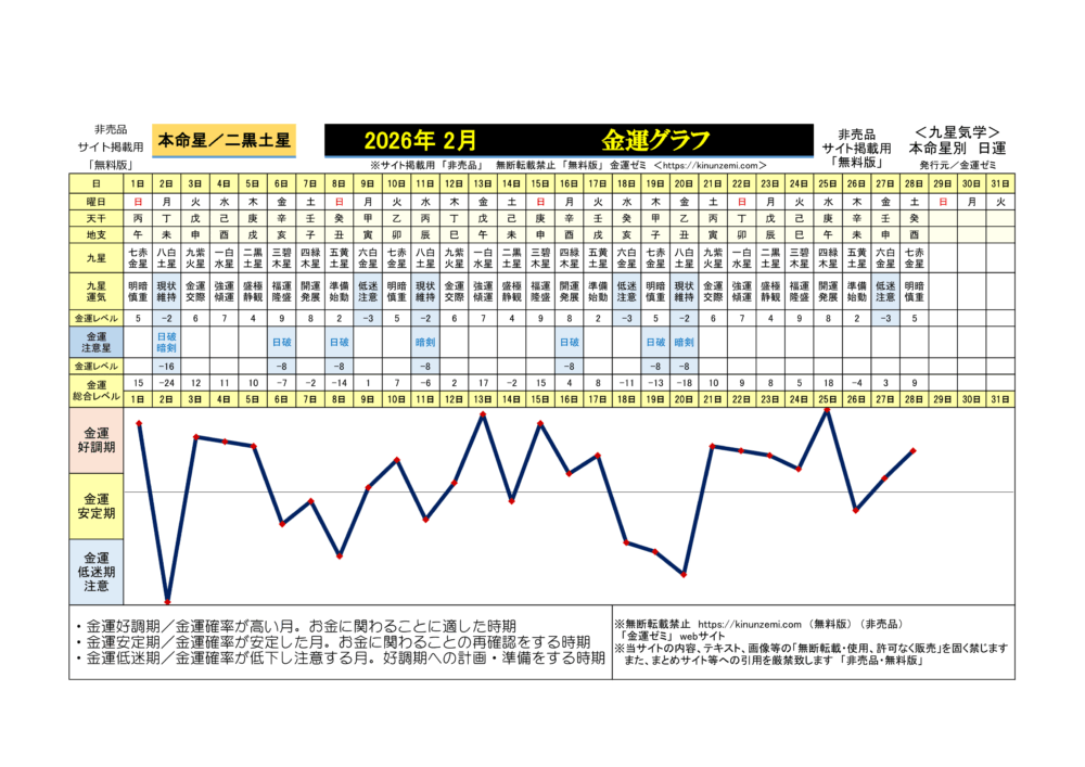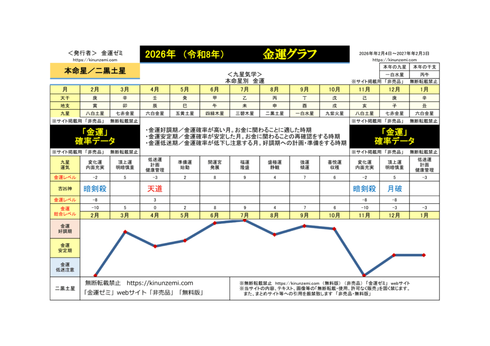 二黒土星/毎月運の金運グラフ(2026年2月~2027年1月)