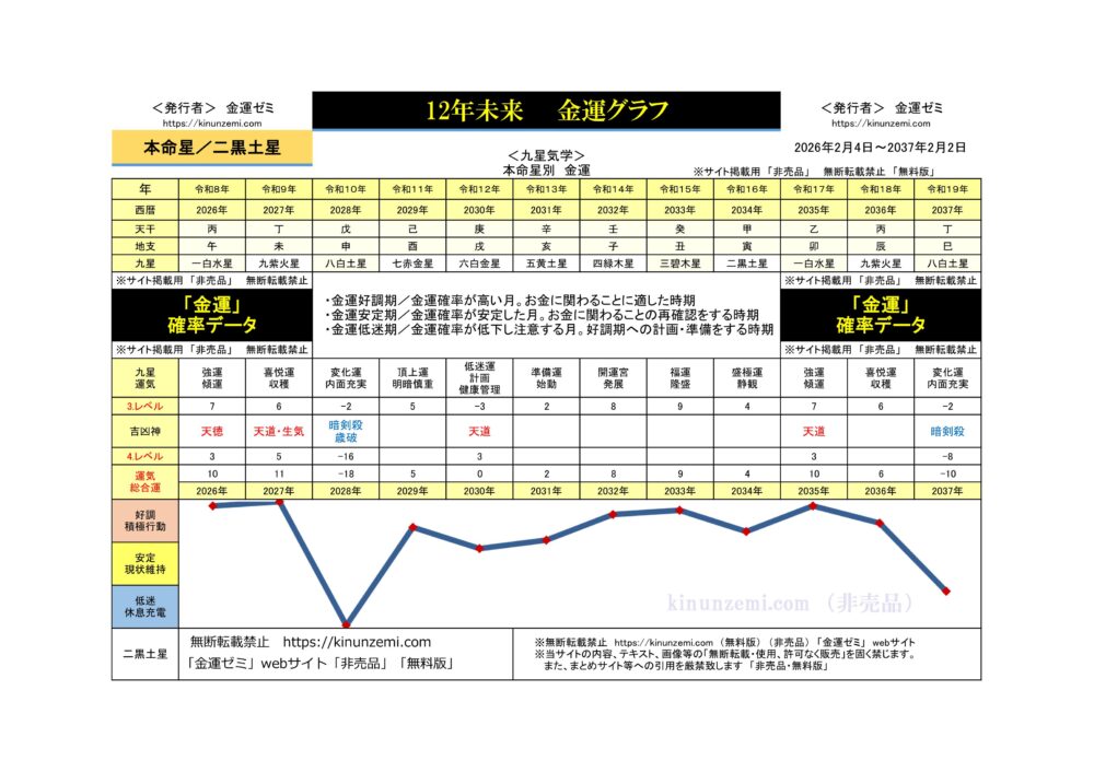 二黒土星/12年未来年運、金運グラフ(2026年~2037年)