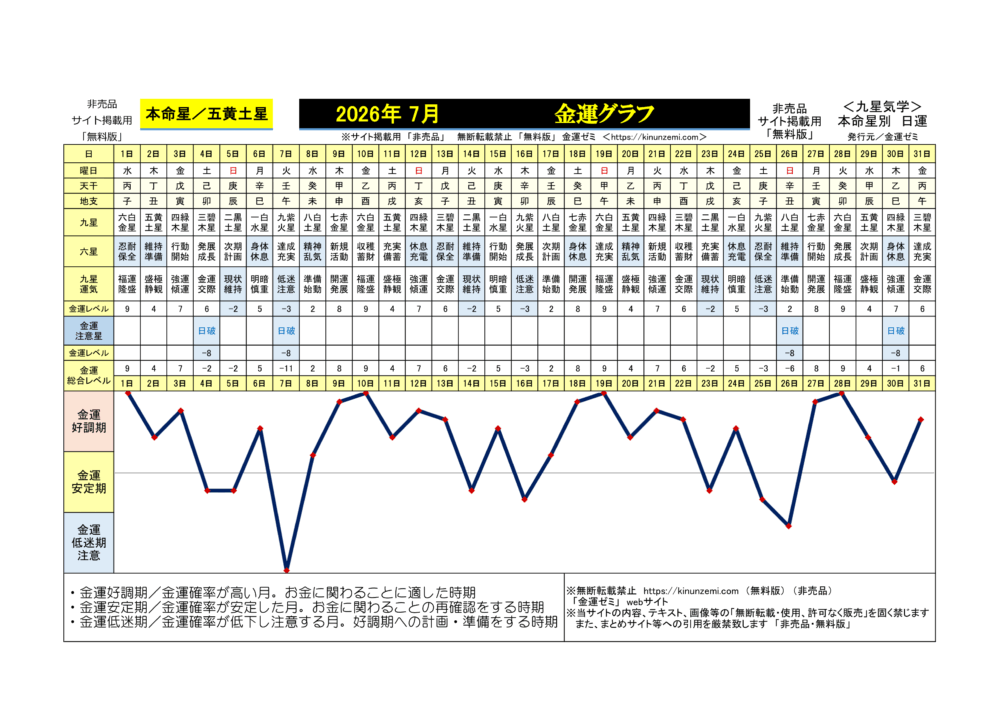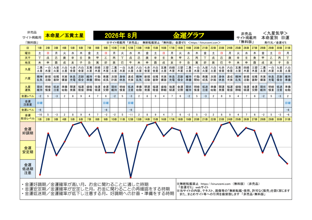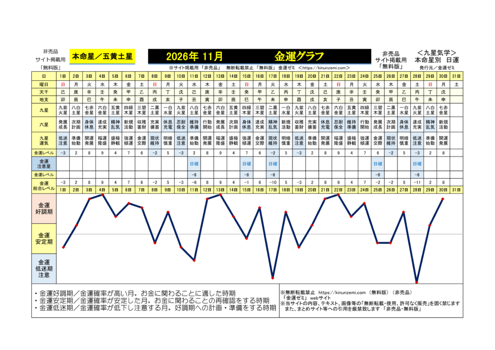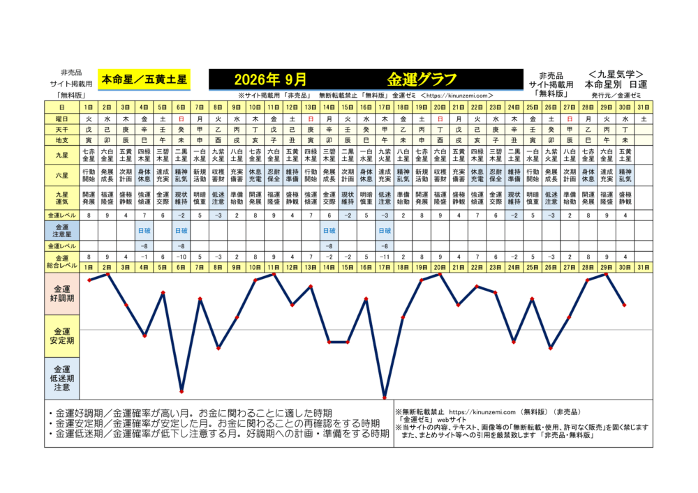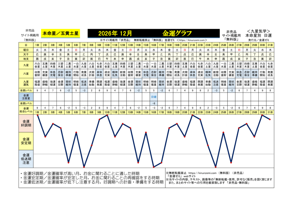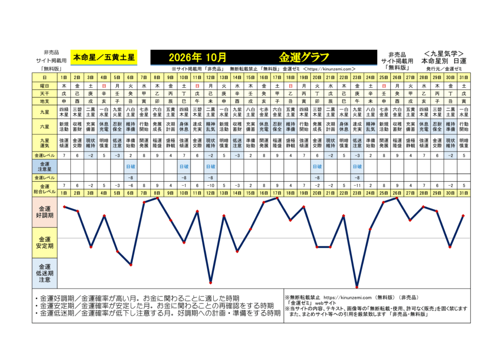 五黄土星/毎月運の金運グラフ(2026年2月~2027年1月)
