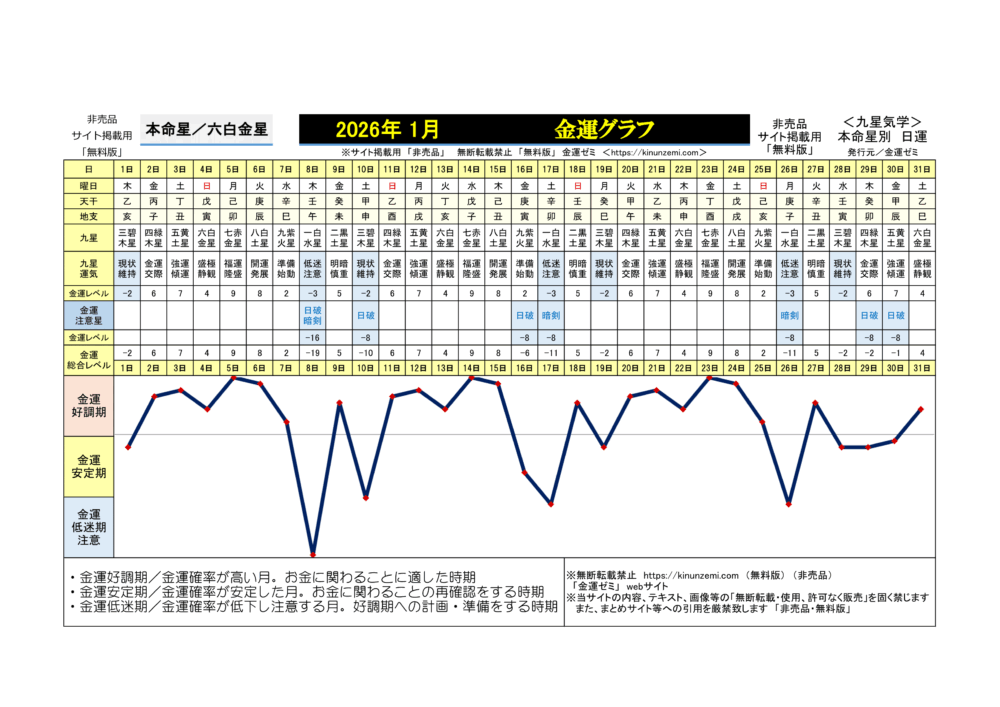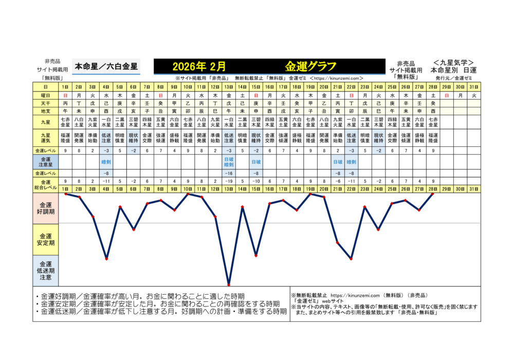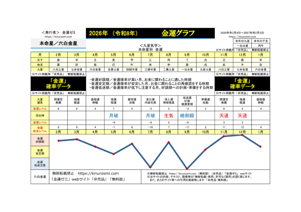 六白金星/毎月運の金運グラフ(2026年2月~2027年1月)