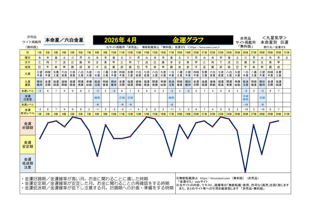 金運、暗剣日「暗やみから剣が飛んでくる」という意味で外部からの災難(突然の災い)が起こりやすい要注意日。仕事、人間関係、病気、事故など突然のトラブルに巻き込まれる、詐欺被害など損害、散財になりやすいので気を引き締めて用心してください。