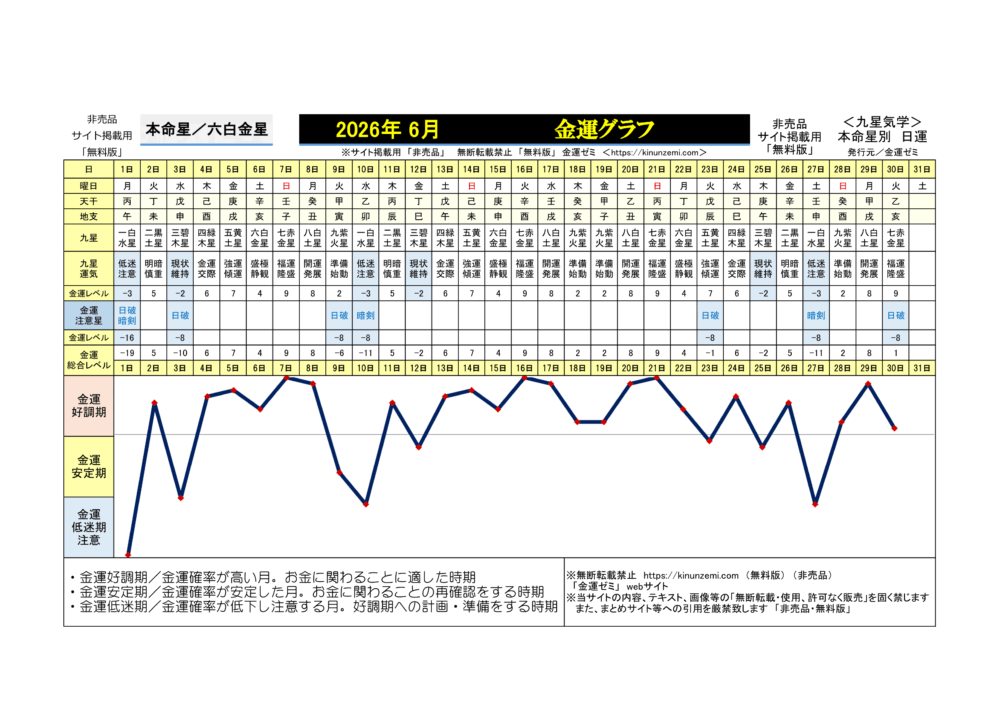 金運グラフであなたの年月日金運リズムのタイミングを参考にマネープラン立てましょう。そして、できる限り資産を増やし財産を守りながら安定した金運を維持してください。豊かで幸福な人生になることを願っております。