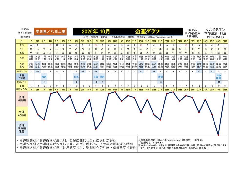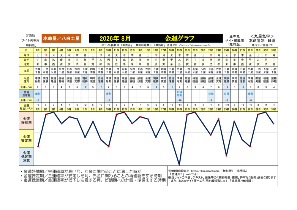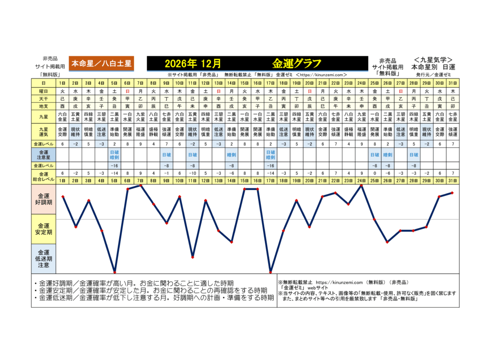八白土星/毎月運の金運グラフ(2026年2月~2027年1月)