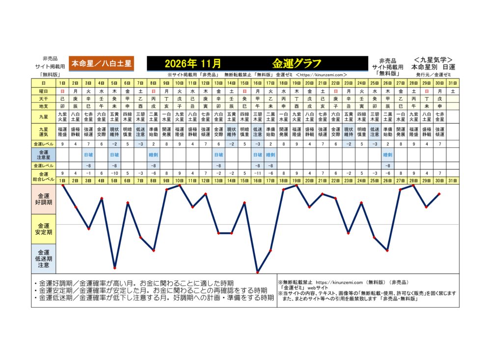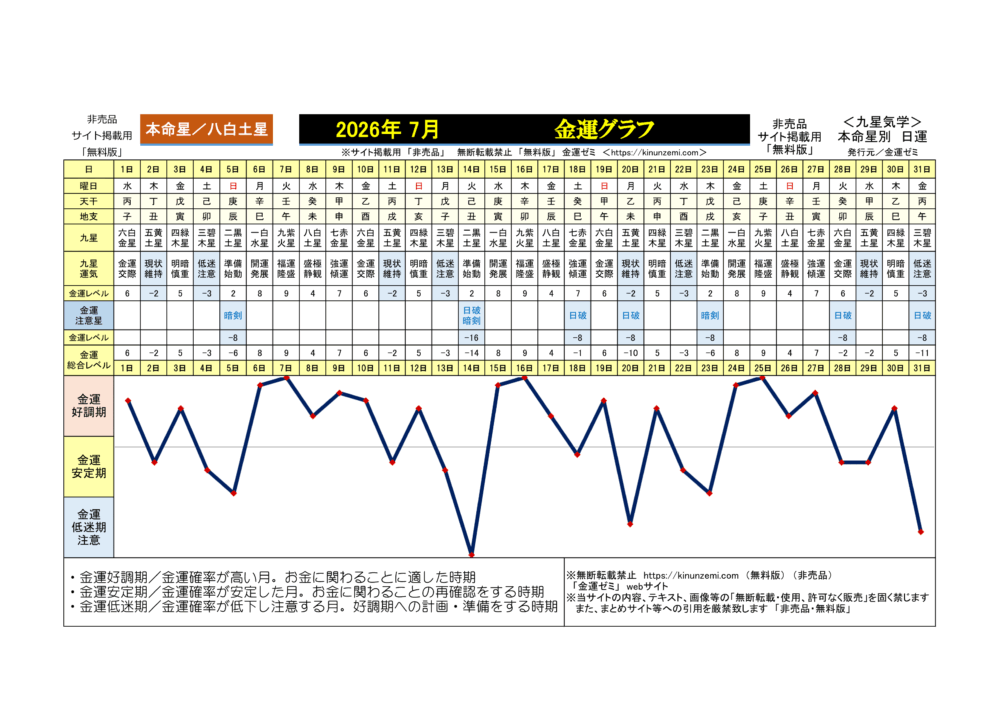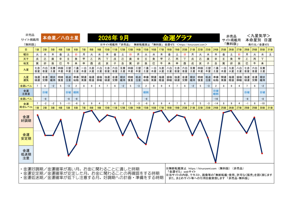 金運グラフであなたの年月日金運リズムのタイミングを参考にマネープラン立てましょう。そして、できる限り資産を増やし財産を守りながら安定した金運を維持してください。豊かで幸福な人生になることを願っております。