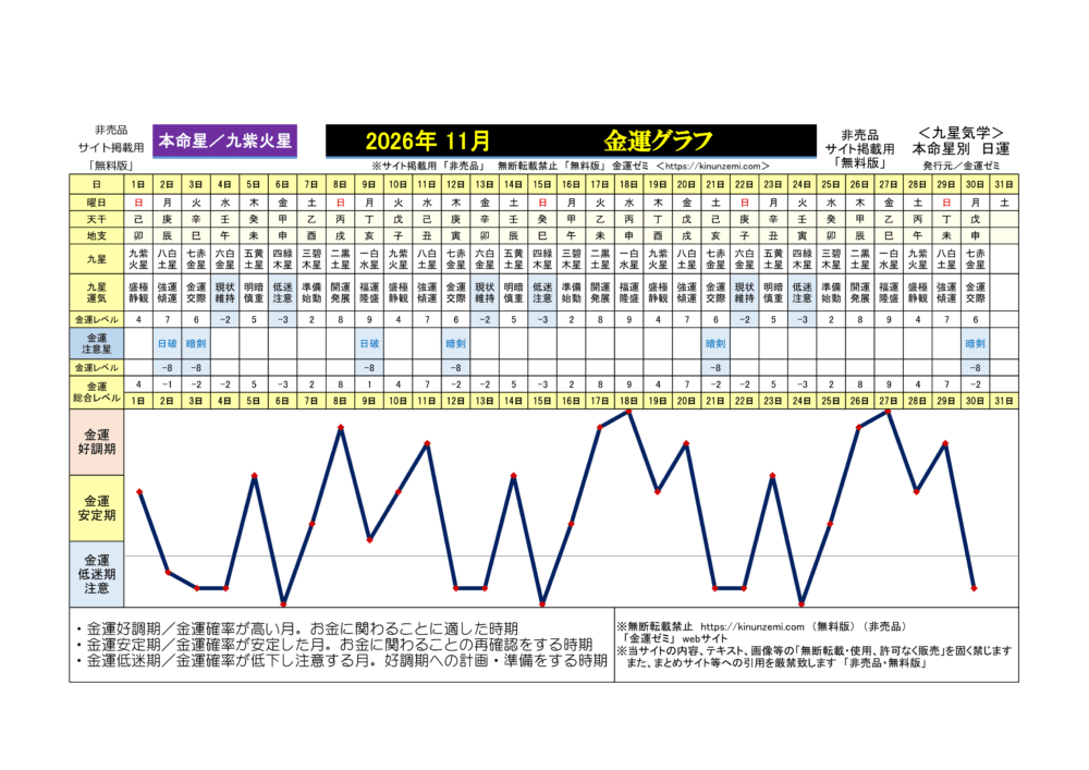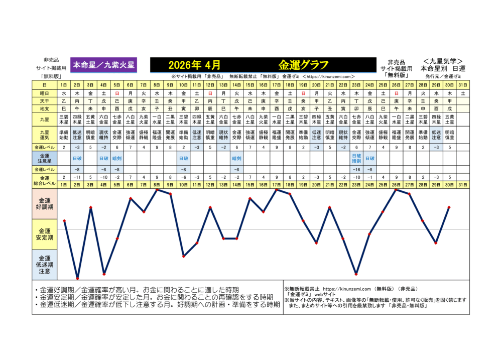 金運グラフであなたの年月日金運リズムのタイミングを参考にマネープラン立てましょう。そして、できる限り資産を増やし財産を守りながら安定した金運を維持してください。豊かで幸福な人生になることを願っております。