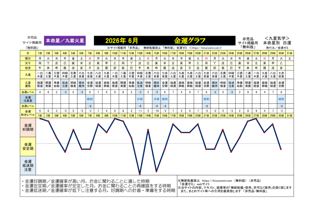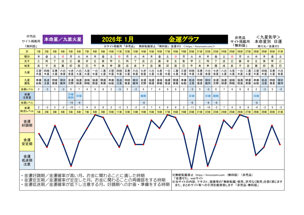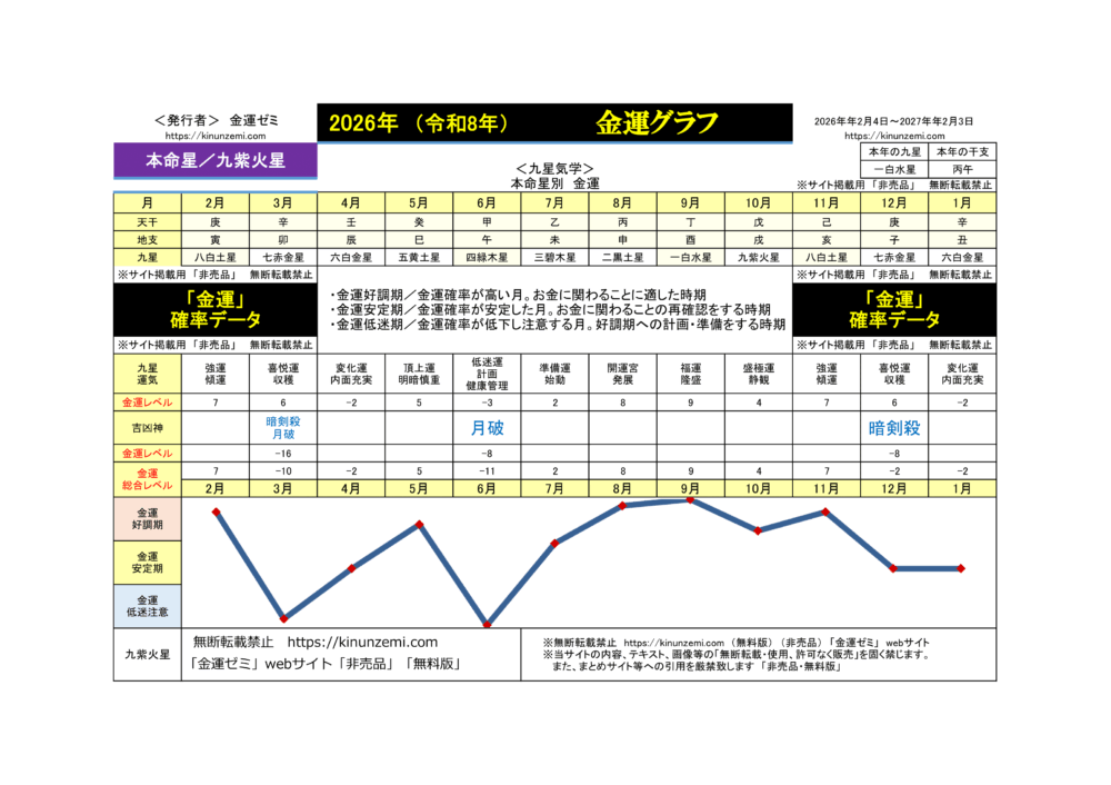 九紫火星/毎月運の金運グラフ(2026年2月~2027年1月)