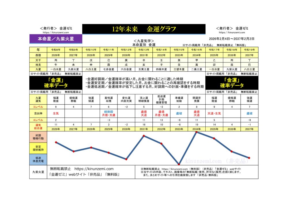 九紫火星/12年未来年運、金運グラフ(2026年~2037年)