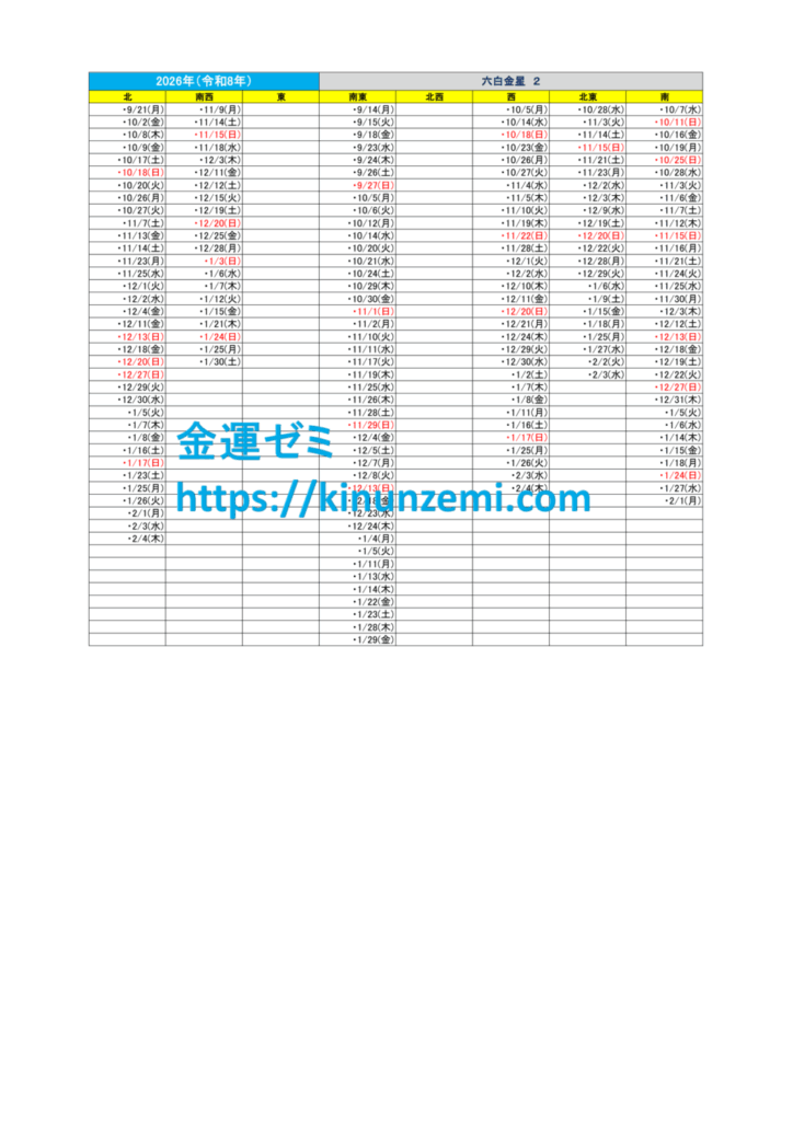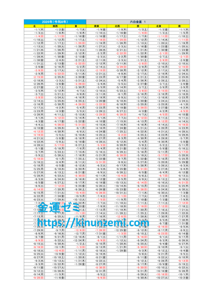 六白金星/2026年2月~12月、毎日の吉方位一覧