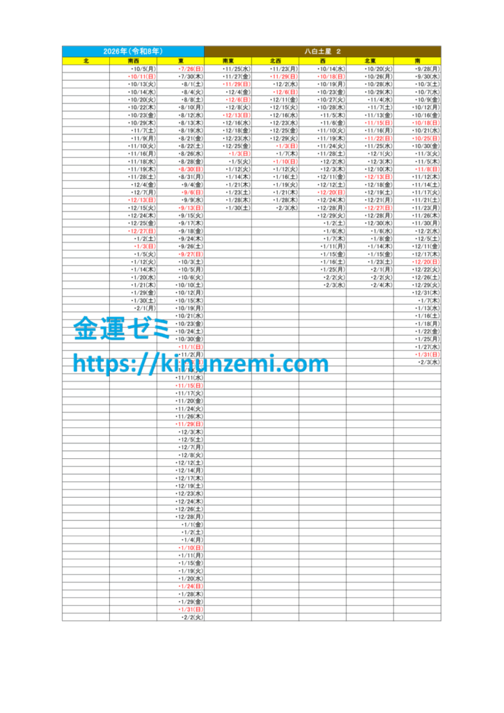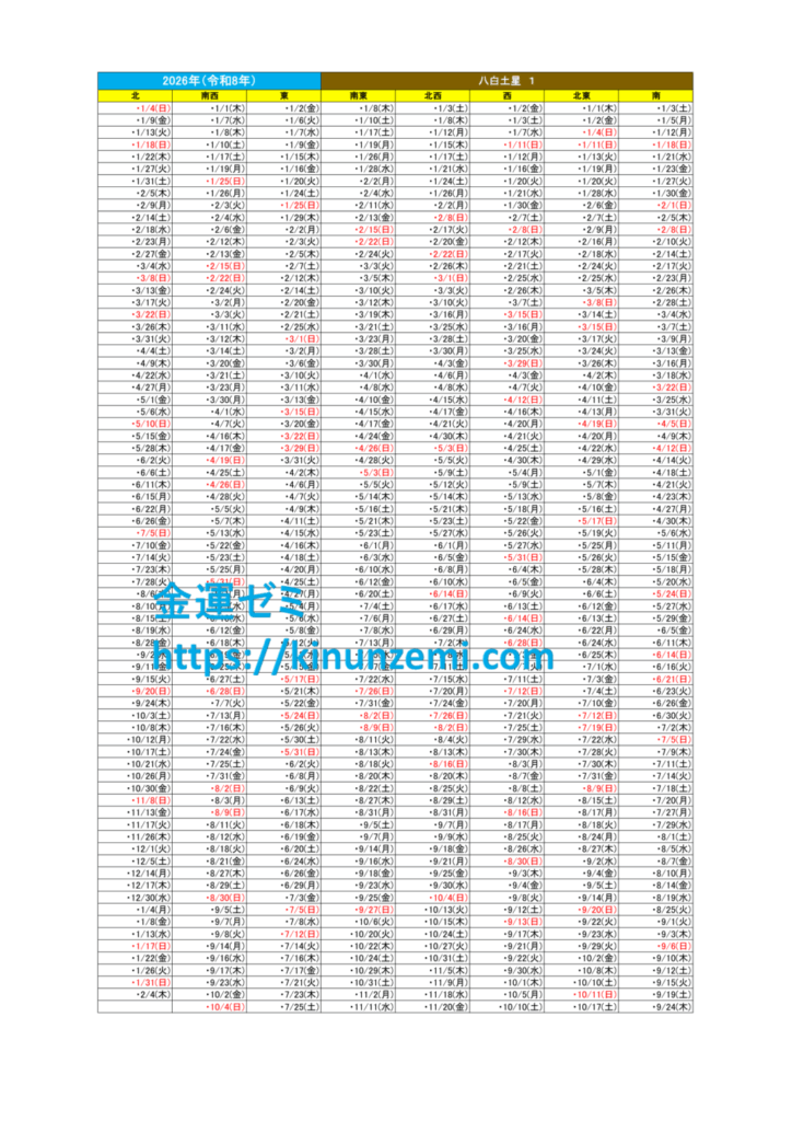 八白土星/2026年2月~12月、毎日の吉方位一覧